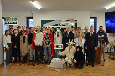 W piątek 19 grudnia 2025 r. w Zespole Szkół nr 2 im. E. Kwiatkowskiego w Puławach odbyło się spotkanie społeczności szkolnej, będące okazją do refleksji nad nadchodzącymi Świętami Bożego Narodzenia. Zebrani obejrzeli jasełka „Rzecz o Bożym Narodzeniu” - poruszające i wartościowe przedstawienie, przygotowane przez młodzież pod kierunkiem Urszuli Strojek, które w prosty, a zarazem piękny sposób ukazało sens narodzin Jezusa.